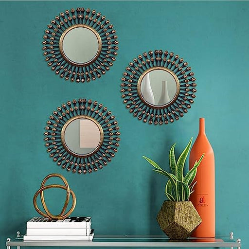 PACKAGE CONTENTS:- Set of 3 Round Wall Decorative Mirror having dimension of 13.2 x 13.2 Inch of Each mirror and 13.2 Inch (Height) & 43 Inch (...