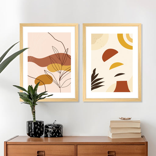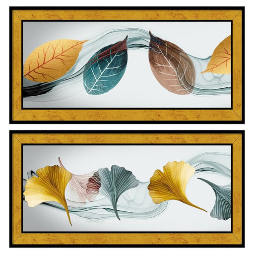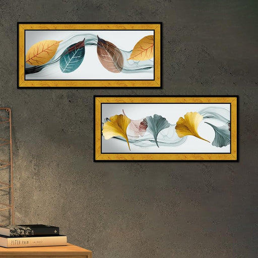 Art Street Modern Art Abstract Floating Leaf Poster Framed Art Print For Living Room, Decorative Home & Wall Decor - Set Of 2 (Golden, 8x18 Inc...