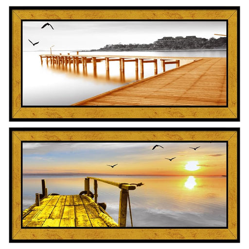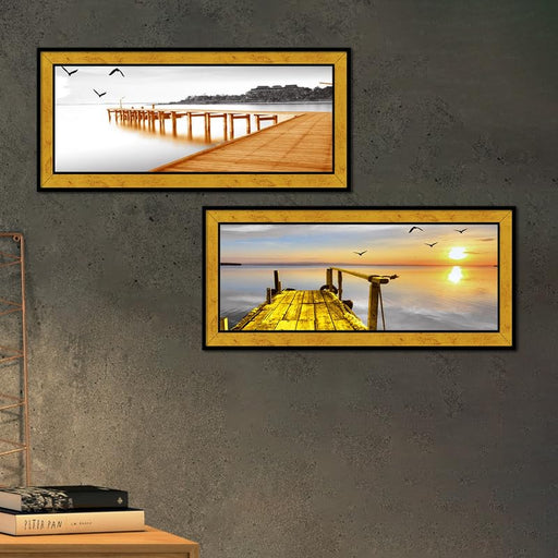 Painting Mantra Landscape Peir Sunrise on Water Poster Framed Art Print For Living Room, Decorative Home & Wall Decor - Set Of 2 (Golden, 8x18 ...