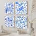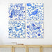 Set of 4 Stretched Canvas Painting Blue Flowers and Birds Moroccan Pattern Art.